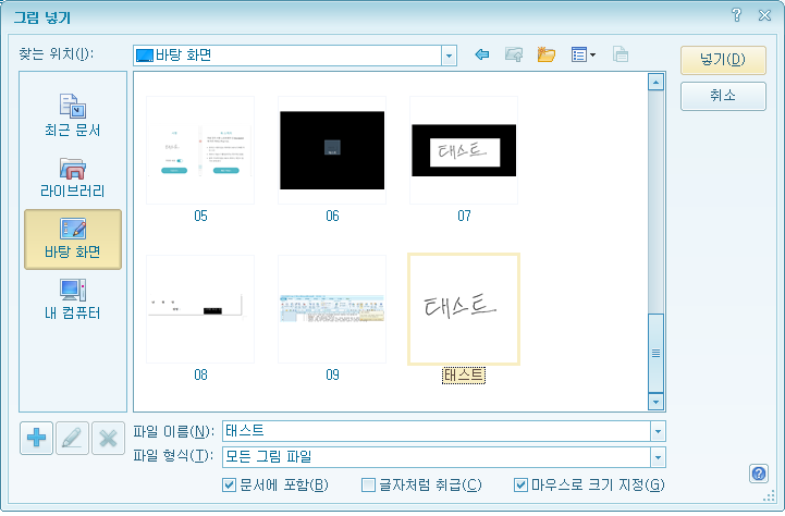 한글에서는 편집 클릭후 입력란에 그림을 글릭하시면 그림을 넣을수 있는 그림 넣기 창이 열립니다.