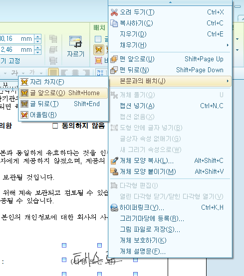개체 속성을 열필요없이 사인(서명) 그림파인에 마우스 우측클릭후 본문과의 배치 , 글 앞으로 로 선택하셔도 됩니다.