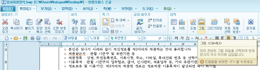 위에서 만든 온라인 사인(서명)을 한글 서류양식에 추가하는 방법을 써볼까 합니다. 아시는 분은 아시겠지만, 오랜기간 사용을 안하거나, 사용을 전혀 안하신 분들을 위해 사용방법을 추가하게 되었습니다.^^