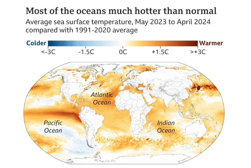 2023년 3월부터 전 세계 해양의 평균 표면 온도가 장기적 기준을 점점 더 뛰어넘기 시작하여 8월에 최고 기록을 경신했습니다 .
