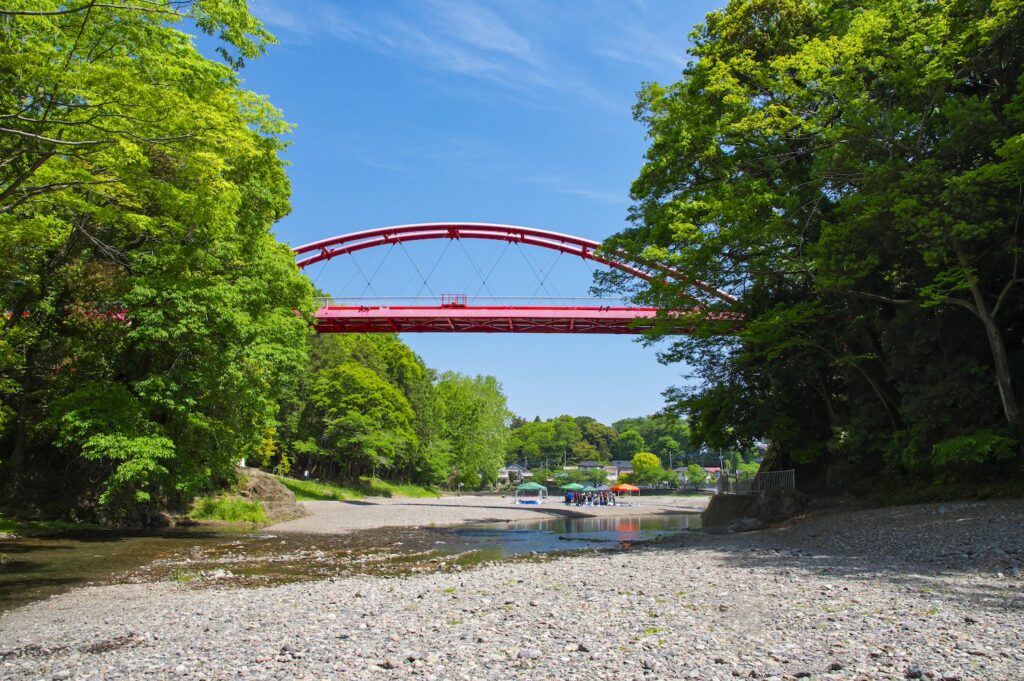 사이타마현 한노시는 자연이 풍부하고 이루마 강이 있는 곳입니다. 강은 넓고 3~5m 깊이의 물에 뛰어들어 즐거운 시간을 보낼 수 있습니다. 그러나 일부 지점은 얕습니다. 특히 건기에는 가족에게 좋습니다. 강둑은 강에서 경치 좋은 아름다움과 재미있는 활동을 즐기면서 바비큐를 하기에 완벽합니다.