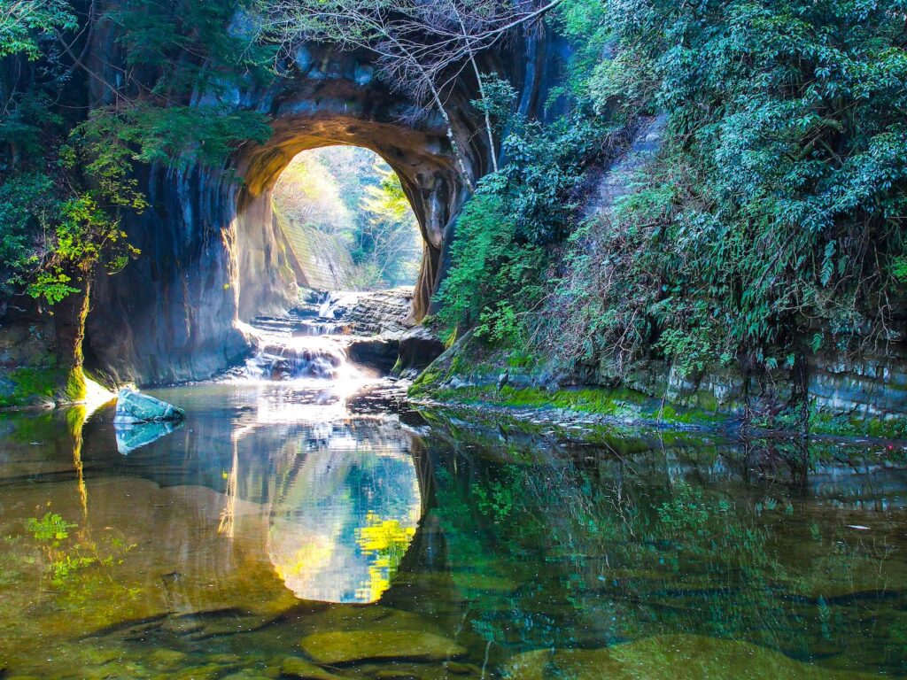 치바 보소 반도의 시미즈 계류 공원에서 노미조 폭포와 가메이와 동굴은 최근 몇 년 동안 그림 같은 특징으로 인해 더욱 인기를 얻고 있습니다. 아침 햇살의 하트 모양과 여름 저녁에 춤추는 반딧불이와 함께 이곳은 훌륭한 수영 장소이기도 합니다. 얕은 물에서 웨이딩을 할 수 있고 완만한 경사의 바위 표면이 있어 등반하기에 적합한 이곳은 다양한 물놀이를 제공합니다.